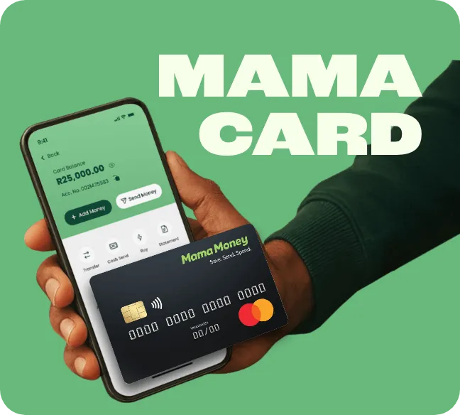 A card and account designed for foreign nationals in S.A. Simply register through the Mama Money App with your Passport, SA ID or Asylum Document. A secure, low-cost way for you to manage your account, buy goods & services by using the app. Do FREE cash loads at Pick n Pay - straight to your Mama Card!